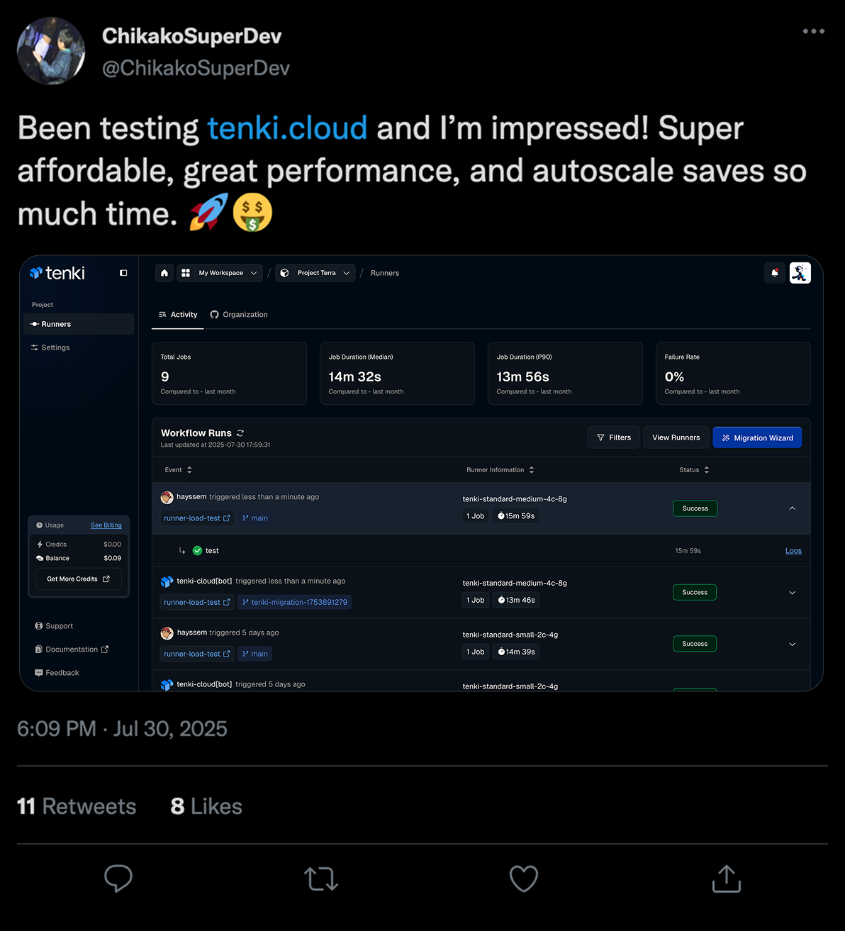 Start using Tenki Runners to power your workflows. Share your job on X, Reddit, or any other platform. Receive a $10 credit, applied to your next billing cycle (one-time reward). Important: The reward is limited to one workspace per user.